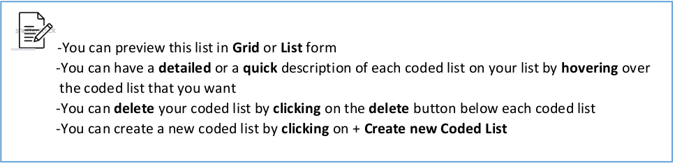 1- Sign-in with your subscribed organization 2- Click on Contribution Catalogue then click on Coded Lists 3- Here you will find a list of all the Coded lists you contributed with 4- Click on +create new Coded List 5- Choose your coded list supported ...